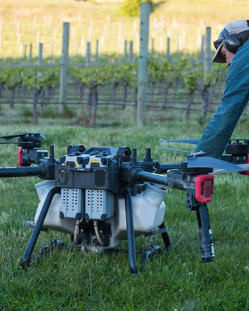 Felton Road uses an electric agricultural drone sprayer to apply organic fungicides and perform crop-monitoring via infrared sensors and terrain-following radar, thereby reducing diesel use (by about 18%) and soil compaction compared with traditional tractors.
